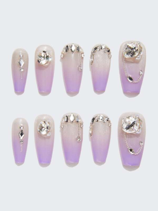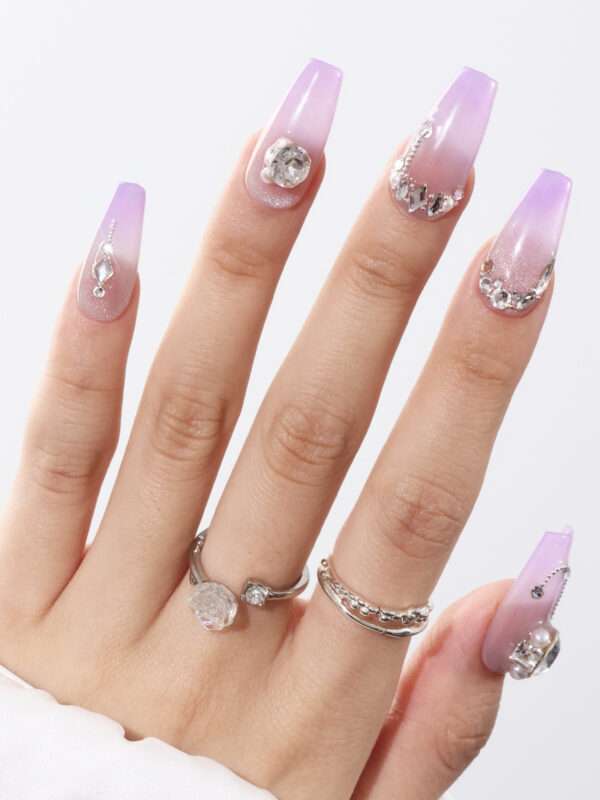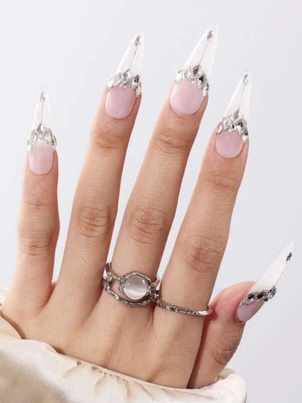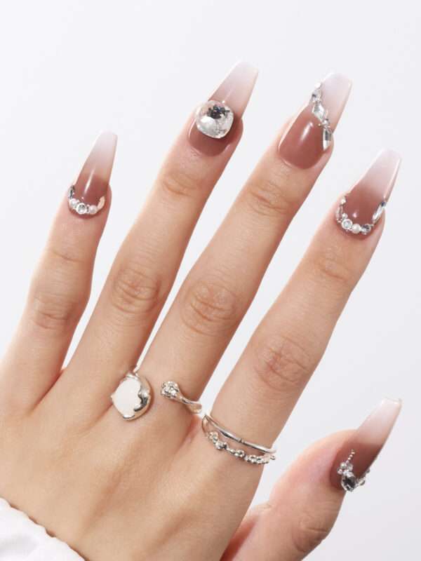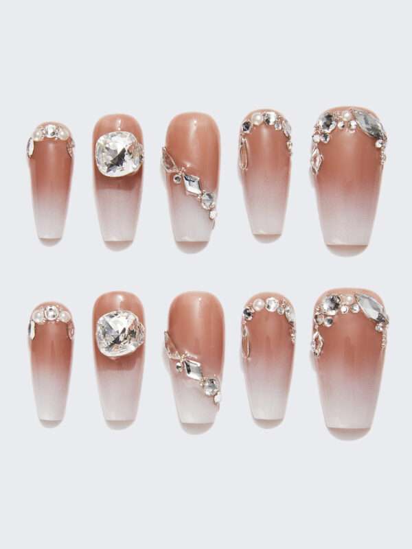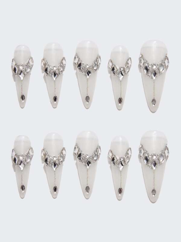 "I recently acquired a set of custom-made, reusable pop-on nails for my wedding, adorned with exquisite Swarovski gems. These elegant nails allow for easy interchangeability and provide a beautiful base to complement my wedding ensemble."